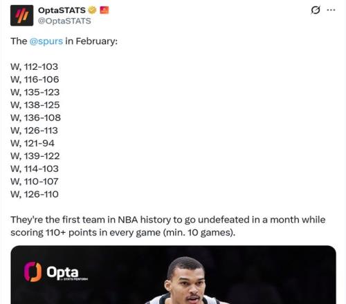 如果算上具体得分,那么这支年轻的马刺队更是打破尘封79年之久的纪录,成为NBA历史至今首支在单月份每场比赛总得分都达到110+分,而且还保持全胜的球队。