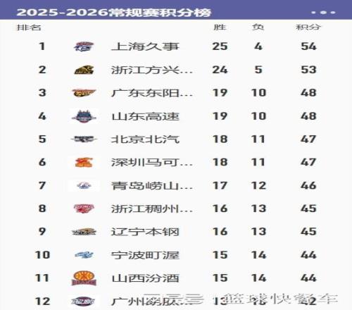 CBA积分榜最新排名出炉!上海冲上第1辽宁第9:广东恐跌出前四