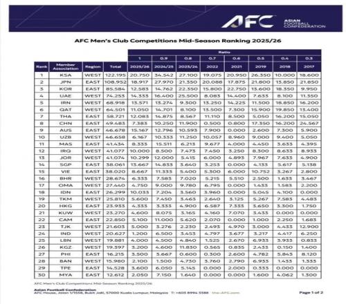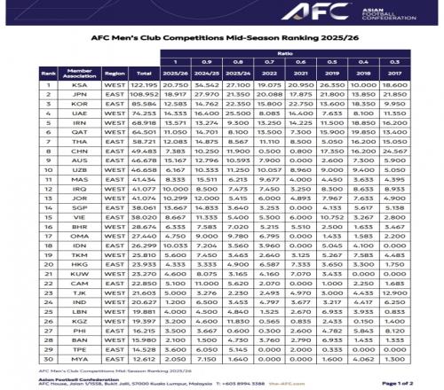 亚足联俱乐部赛事中期排行:沙特联居首中超第八仅领先澳超2.8分
