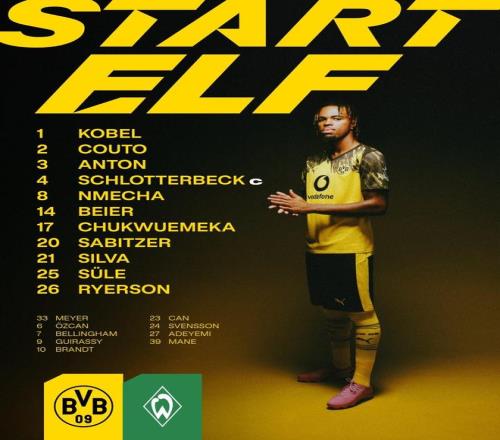 多特vs不莱梅:法比奥席尔瓦、丘库埃梅卡、聚勒首发