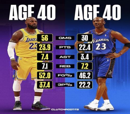 最近一张“40岁数据对比图”在球迷圈传得很凶:詹姆斯40岁赛季56场还能交出23.9分7.4助攻,投篮和三分命中率也很扎实;乔丹40岁在奇才只打30场,数据依旧能看,但效率和组织差了一截。把这两组数字摆到一起,讨论点就很直白了——一个把“续航”和“累计价值”拉到离谱,另一个靠巅峰期的冠军和统治力封神:到底谁才该排历史第一?