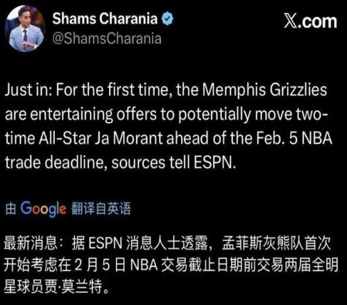 面对这一连串的风波,灰熊也终于不忍了。近期报道,莫兰特已经正式被灰熊放入交易讨论之中。而相比于此前的流言消息,业内人士爆料,莫兰特在今年交易截止日(2月6日)之前,基本已经大概率离队了。