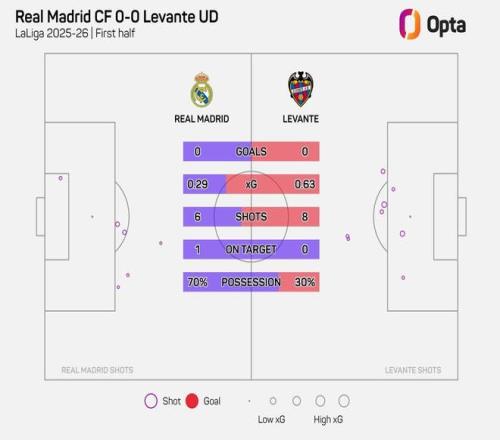 皇马对阵莱万特上半时仅6次射门,近8年球队主帅西甲首秀最少