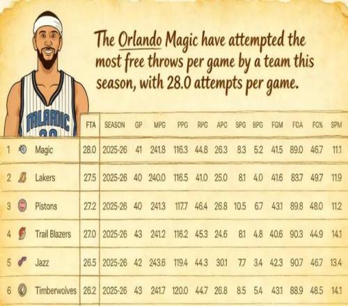魔术场均罚球联盟最多,是因为他们的内线优势,瓦格纳和班切罗都有出色的低位进攻技术;湖人罚球多,是因为东契奇、里夫斯、詹姆斯出色的造犯规能力;活塞是因为坎宁安、杜伦领衔的青年军在前场的超强冲击力。